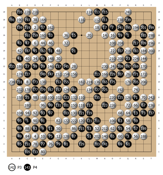 中国棋手在首轮表现平平,局势接近了。黑39粘上左边,黑棋不敢挡,